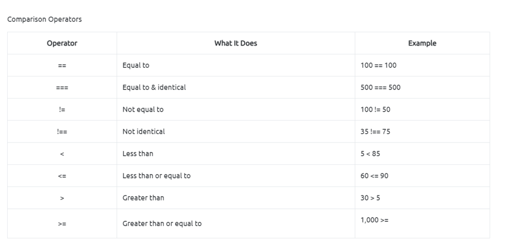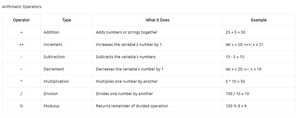 These two tables cover the majority of what we will be going over moving forward, but there are still so many more things that we won’t be able to cover. Once you finish learning about the basics of JavaScript, I recommend researching more about operators as there are still boolean operators (true or false) and logical operators (AND, OR, NOT).